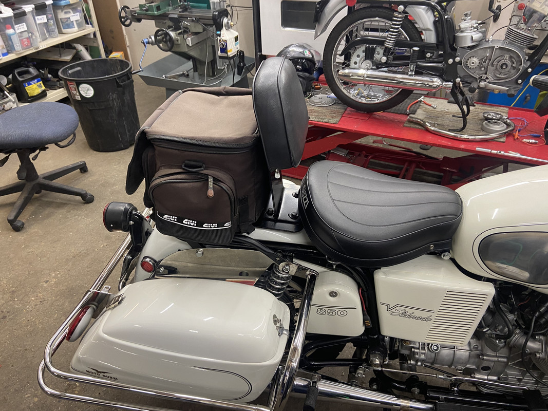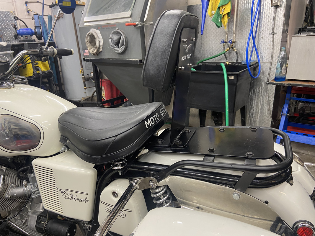 On a touring bike, or any bike I plan on racking up long hours in the saddle, a back rest keeps me comfortable and makes long days riding so much easier. My 72 Eldorado has been fitted with a single seat and I had a spare rack kicking around that hung off the back of a dual seat. Some cutting of the old rack, new brackets and the rack now sits behind the solo seat. I then cut 3/16" steel plate for a flat surface across the rack top and welded some nuts to the underside for a removable back rest support. I had a piece of 1/4" thick aluminum bonded to soft foam and a vinyl cover sewn up at a local upholstery shop. Captive nuts are rivited into the aluminum plate to take M6 x 1 stainless cap screws.The back rest support is also 3/16" steel and bolts through slotted holes to the steelplate. I can adjust the lcoation of the back rest by 1" for and aft.I shimmed the padded rest lower bolts to get the angle I wanted beyond the bent steel vertical plate. I powder coated the parts in my shop oven.My old Givi tail bag clips to the rack, ready to head to Alaska and Yukon at the end of July, my buddy is joining me on his 75 Goldwing GL1000. Two old guys on old bikes!The depth of the foam and the slight spring in the steel plate makes for a nice cushy feel across my back, a Lazy Boy for the road.
