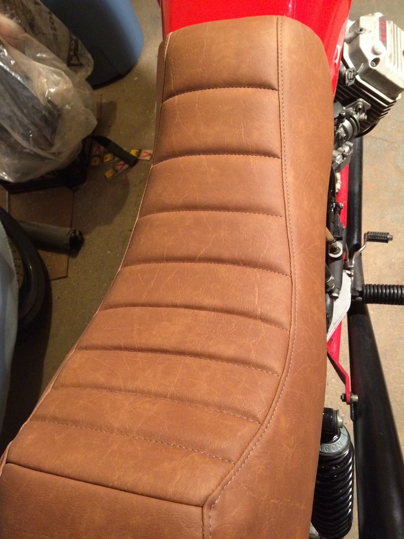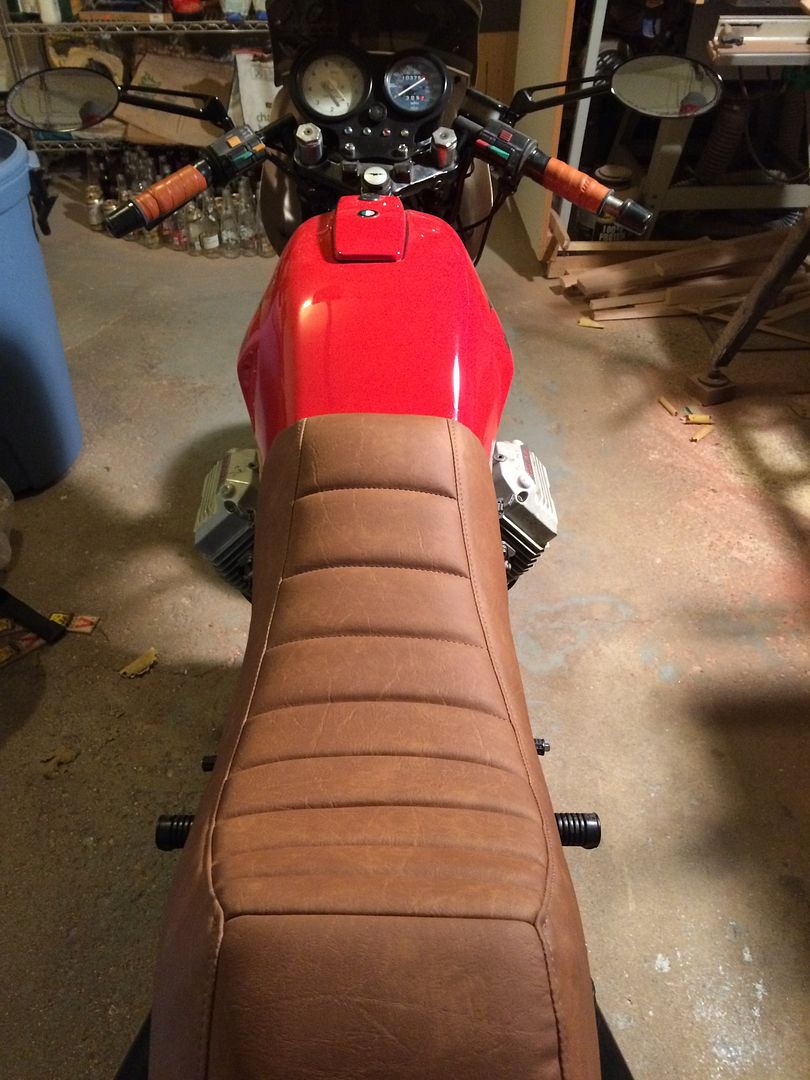 This is buried in my Lario build thread; just got my seat back and pretty impressed with this guys work. I spent a good part of a year debating this seat and always liked the LM wrap-around (the tank) idea. I'm a fan of that bike as its my favorite Guzzi. Anyhow, this is with stock Lario tank and seat all re-positioned and re-fab'd.