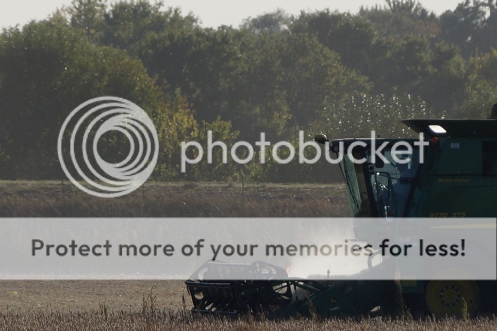 Our share cropping farmer harvested our soybeans today. This field was to the W and S/W of our house. Sorry the pics are not more clear but I was sbooting from about a 1/3 of a mile away. Always an impressive sight.