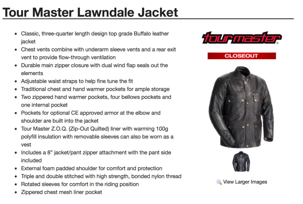 No relation to the seller, but I have purchased a few items from them in the past. If you're looking for a good 3/4 length leather jacket, here you go! http://www.motorcyclegear.com/street/closeouts/leather_suits_jackets_and_pants/tour_master/lawndale_jacket.html