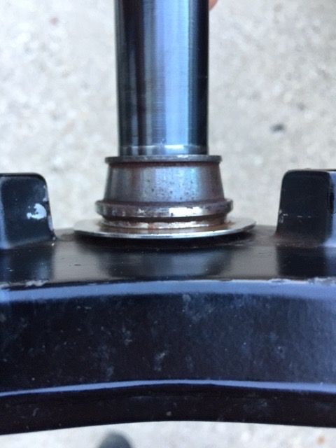 Grind that sucker off! Just be aware there is an alloy spacer below it and the we should be a rubber water/dust seal that sits under that. That's the reason for the lipped alloy spacer. If that was missing it explains why the bearing got so rusty!As for getting the new one on? Put the dust seal on and Pocatello the spacer/collar in it. Slide the bearing down as far as it will go on the stem and then use a piece of pipe that fits over the stem but inside the cage so it sits on the top of the race to either press the bearing down from the top, (If you're careful you can tap t down tith a hammer.) until it seats on the spacer, or invert the whole lot in the press and press the stem through the bearing until it seats.Pete