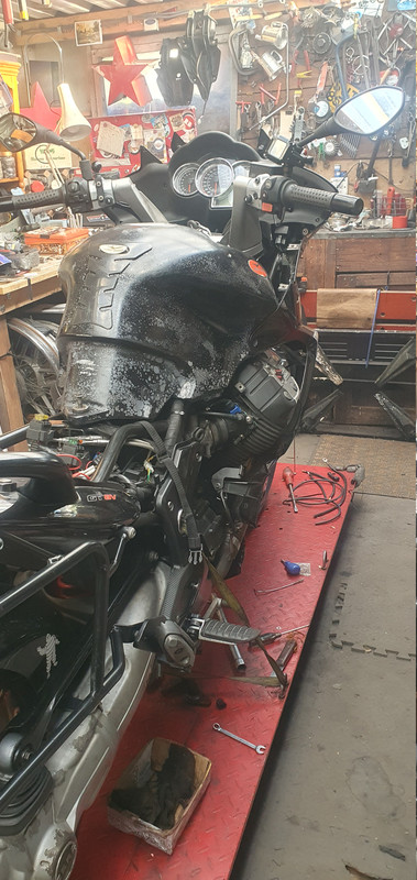 Popped the front wheel in so now it's off the engine stand and on the main stand. No longer attached to the scaffolding frame and down a notch on the bench height. Think today I'll get the throttle bodies on and start tying in the loose wiring and hoses.