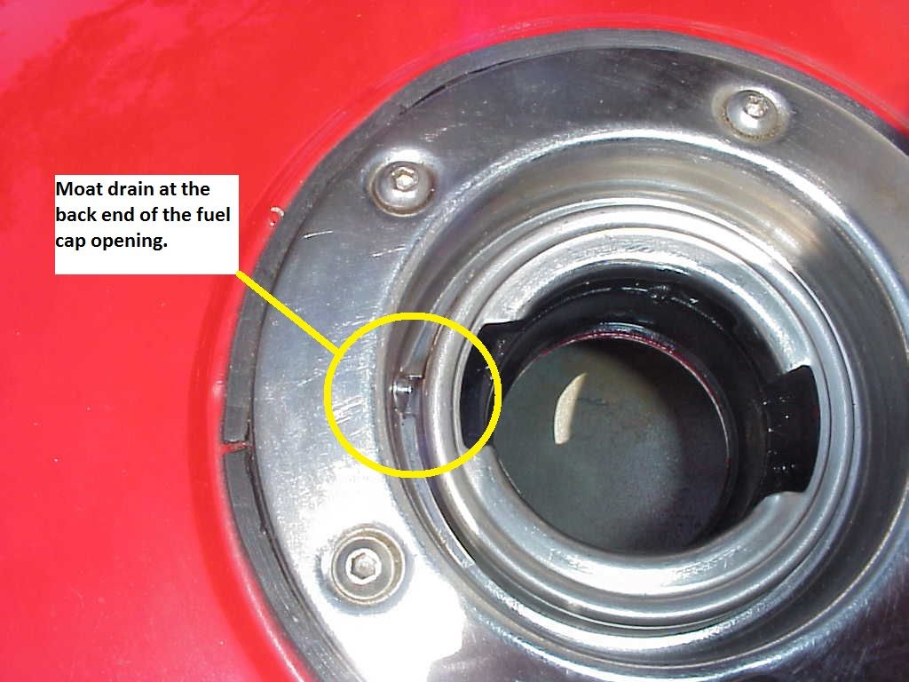 Now, when fuel evaporates, it leaves sticky residue.  Any dust, grime, pollen, etc. sticks to the fuel residue and eventually completely blocks the drain.  Now, if you ride it the rain or wash your bike, the water does not drain away but fills the moat.  As soon as you remove the fuel cap, some of it spills into the tank and then sinks to the very bottom.  It may periodically get sucked into your fuel stream and cause some performance hesitation.  More likely it will just puddle at the bottom of the tank and eventually rust its way out.