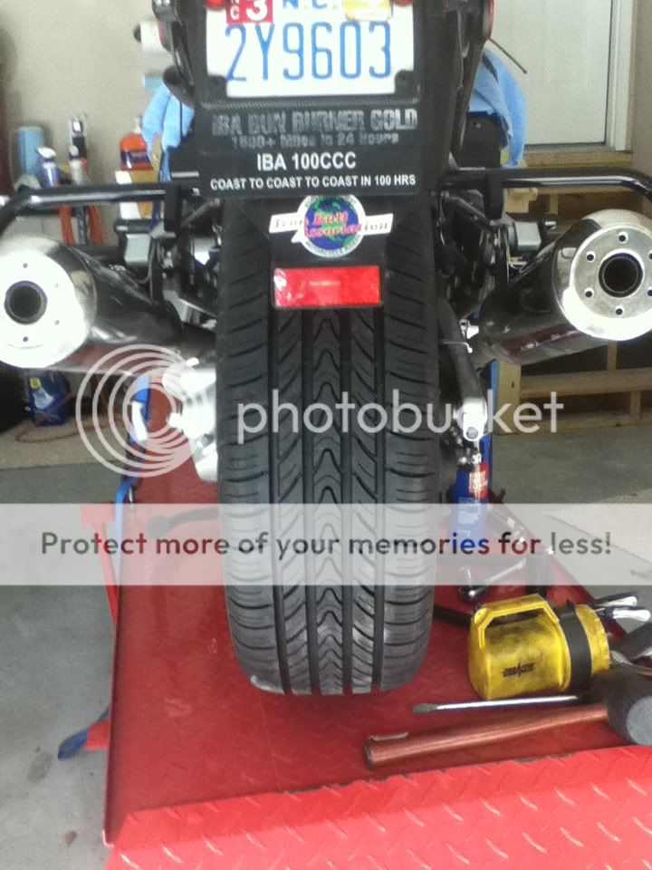 Dealership wanted $200 to put the tires on because of the bags.  Wow.  I stripped off the bags and mounts, will ride with the sides nude for a bit.  Mufflers swing out of the way of the axle.  EX job.  Oh, and no grease at all on the splines!!!!   None.