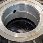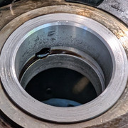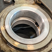 Pulled the flywheel cover out, and the ring gear has seen some action. What do you suppose caused this? Inside of the bell housing is unmarred, so I think the thrust-bearing/end-play is ok. Looks like maybe the starter hit the ring gear while the engine was running and spun against it for a bit?