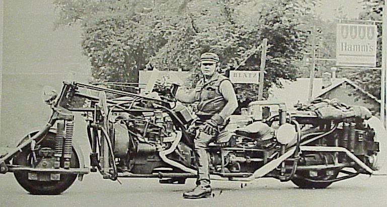 The Roaddog plus others http://www.factoryfat.com/moreautofour.htmlThe Gelbke story by Buzz Wallneck: By Buzz Walneck Back in 1965 a guy by the name of William Gelbke, also known as "Wild Bill", constructed a bike of his own design. He dubbed his creation "ROADOG" and began touring the United States on it. Bill and ROADOG were seen all over the country. It is said that Bill put over 20,000 miles on ROADOG the first year alone. Bill graduated college in Wisconsin as an electronic engineer and moved out to California for additional schooling at a Southern California University. On leaving there, he was scooped up by McDonell-Douglas for work in a defense system program. Bill did not enjoy his work at McDonell-Douglas. He dreamed of designing and building motorcycles. One day, he decided to realize his dreams and he left McDonell-Douglas. Now he was free to build motorcycles his way! He began to design ROADOG. His design included Earles front forks, an automatic transmission and lots of power for touring and reliability. Add to that a shaft drive and disc brakes...OVER 30-YEARS AGO! Bill moved to Chicago and opened up a cycle shop on Cicero Avenue. That was about 1962, when his plan was to build a prototype bike that he would test and ultimately put into production as a smaller model. His plan for the production model included an 80-cubic inch, English automotive 4-cylinder engine with an automatic transmission and shaft drive. With "ROADOG" Bill wanted a bike that would cruise indefinitely at 90+ MPH. He wanted a bike as reliable as could be made. With an "IRON DUKE" 4-cylinder 152 cubic inch Chevy II engine, a Powerglide transmission, a modified Chevy differential and Corvette disc brakes, that type of reliability was accomplished. ROADOG had no side stand, but was parked with the use of four hydraulic rams, which were individually deployed by the driver. After touring the country, Bill went to work on the production model which was called the "Gelbke Auto-Four". While larger than a big Harley, they were quite a bit smaller than ROADOG and employed an Austin Mini engine and transmission. About 8-were produced and sold. In 1972 an article on ROADOG was printed in a magazine. The article stated that the bike was 17-feet long and weighed 3,280 pounds! Also, that it could easily cruise at 90+ MPH, and that Bill had driven the bike more than 20,000 miles with no problems. The article pointed out that Bill's goals were to produce a bike that was dependable, had out-standing highway roadability, and high-speed, long distance cruising ability. Bill certainly achieved his goals! We have heard quite a few stories from old friends of Bill. Some go like this: "Let's take a ride (from Wisconsin), to Oklahoma where you can get a really good steak". Or "Let's take a ride to Texas where they have really good beer"• often done in February or March! Another guy told us of seeing "Wild Bill and ROADOG" passing him on the tollway here in Illinois at about 100-MPH!! Before long he spotted Bill and a State Trooper on the side of the road. A few minutes later, he was again passed by Bill and ROADOG, again doing about 100-MPH! Later he stopped at Bill's shop and asked if he had gotten a ticket. Bill told him that the police officer had stopped him just to get a better look at ROADOG! Later Bill moved back to his hometown in northern Wisconsin and went into another field. In 1979 Bill was killed in a domestic dispute and "ROADOG" disappeared not to be seen again for 15-years. Over the years I saw posters in various cycle shops with Bill sitting on the bike, and wondered what ever happened to him and the bike. Was it laying in some garage? Was it rusting away in some junkyard or had it been long ago chopped up as scrap? After about a 6-year search, we did a small article in our magazine, which prompted a couple of calls to us. Then one day "THE CALL" came in. "I know where the big bike "ROADOG" is". Shortly thereafter, we were headed off with a large trailer and bought the bike. The 15-years of storage were pretty kind to it, and it was soon running again. We are keeping it as an unrestored bike, looking just like "Wild Bill" left it.. all those years ago.