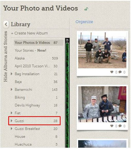 You main album will come up with all of your sub-albums shown to the right.  I've made a mess of my albums and would like to reorganize but I believe that doing so will break the links to all the pictures I have out there and I hate when I go through a thread and the pictures all show they've been removed.  Anyway, we're going to go to the Guzzi album so I'll just click on that.