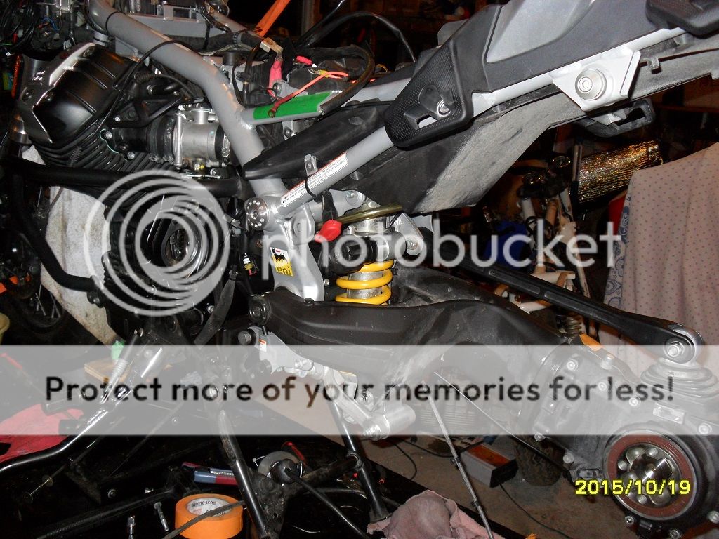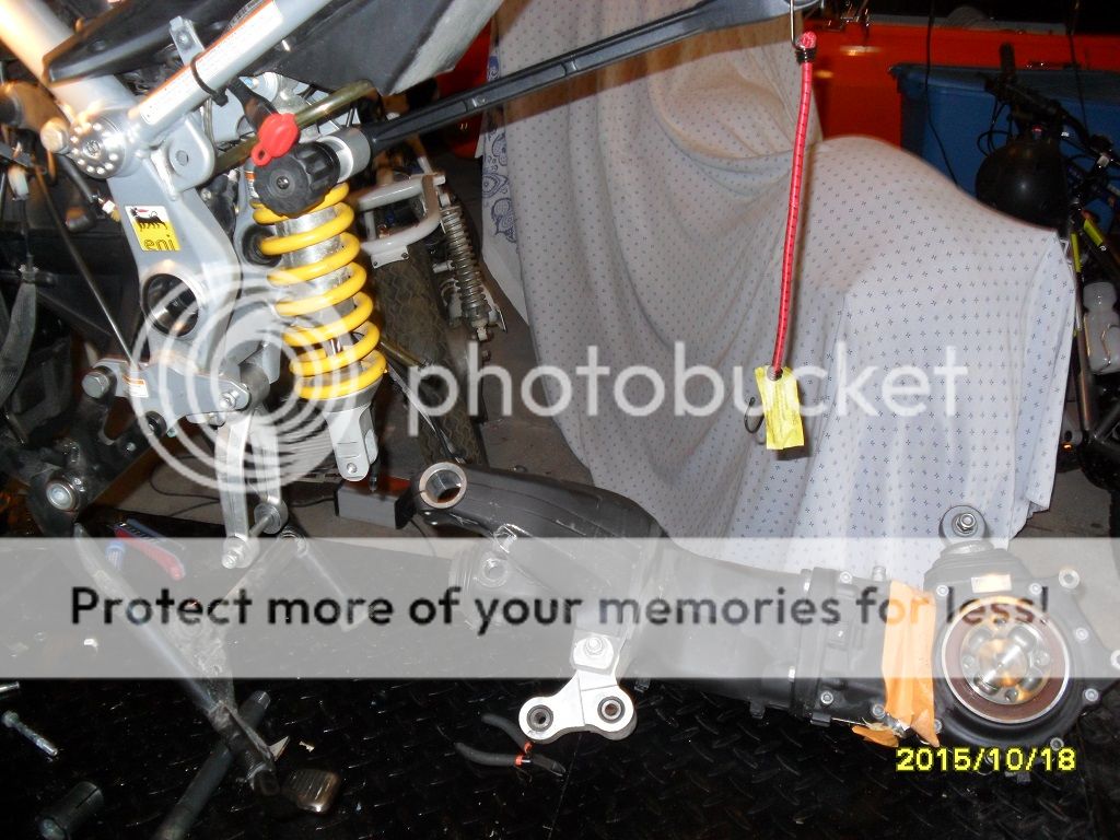 Shock and swingarm going in.  Sorry for the dirt -- I had just come back from a significant ride to/from the Western New York Rally when the clutch gave up and jammed the starter.