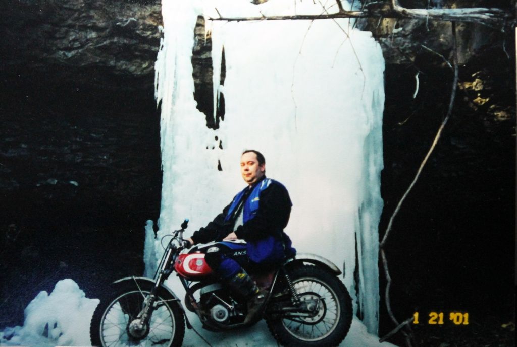 This is a shot of Elmo Schriber on his Bultaco 350 Sherpa, He's Bernie's inbred 3rd cousin at the Ozarks "Trial de icesickle 2001" He came in dead last, even took a 6 on the last section. :wink: