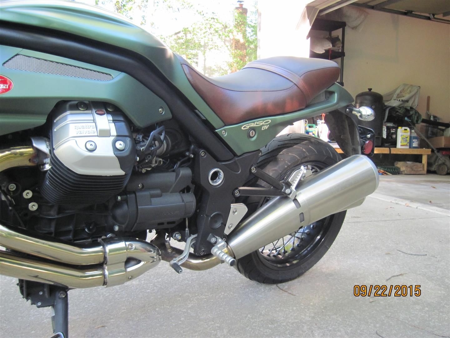 Waltr,Here's a pic of my now-departed Griso with a set of adjustable foot pegs from Twisted Throttle. Each side comes in 3 pieces. The mounting component that attaches to the bike via clevis pin, the 30mm extension that can be rotated to 6-8 positions (don't recall exactly how many,) and the footpeg itself. As shown in the pic, I mounted mine in a forward/slightly lower position.I also use similar setup on the 1200 Sport, with slightly shorter (23mm) extensions, mounted in the same forward/lower position.30 mm isn't much, but it made a lot of difference on the Griso. I should have kept them and used them on the Sport, but since they were already in the eBay pics, they stayed with the bike.I bought the 23mm setup from Zoom Zoom several years ago, and liked them so well I automatically purchased a set for the Griso.A 50mm extension is available, but is too long (for me) Twisted Throttle advised against the 50mm, but I thought I'd try it anyway. They were right, I was wrong!