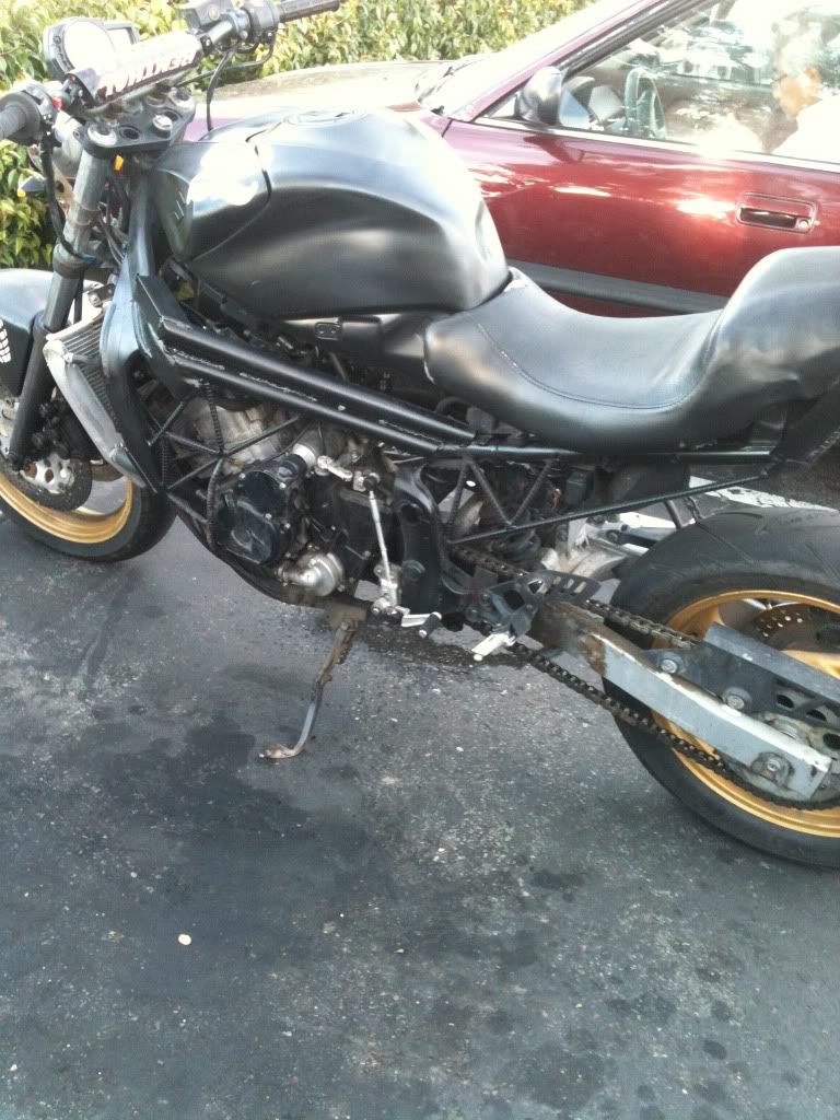 Here's another welding concept someone came up with. Belonged to a guy that was known to burn out the rear tire till it exploded, then get off the bike and kick it over on it's side. I've also never heard a filthier mouth in my life. It's made of chopped up pieces of frame with rebar to hold it all together... it still ran like a champ