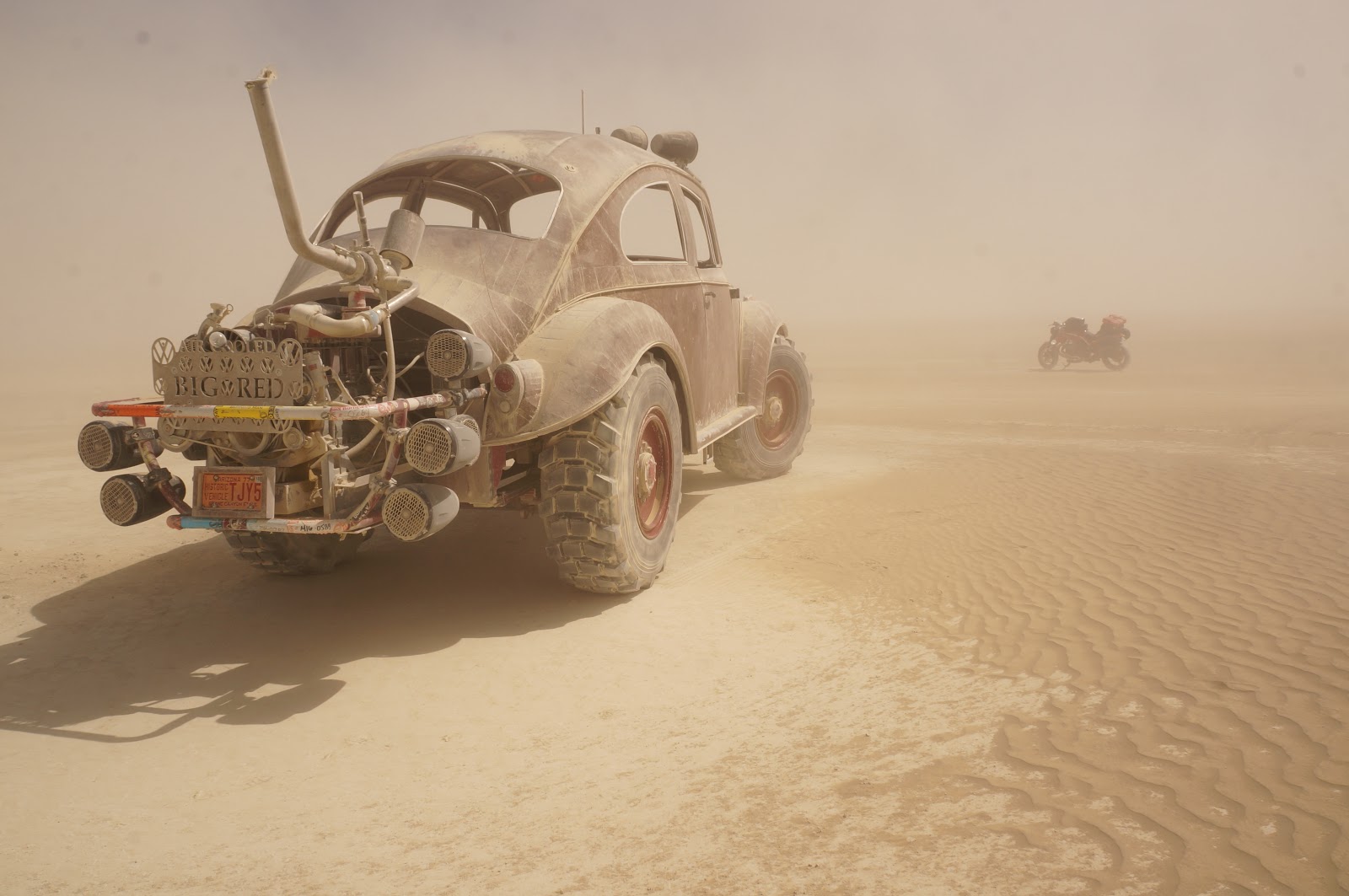 When we went some years back, a nice guy who wanted in on the fun took the whole group of us in his converted Trailways bus motor home.  But he did it on condition that we paid for a complete strip down overhaul afterwards.  I don't think the bus really took much of a beating, the weather was clear the night we rolled in and the day we rolled out.  There may be some elements of myth about that playa dust - I'm sure it's bad, but I still ride a bicycle I used down there, haven't noticed any corrosion issues.