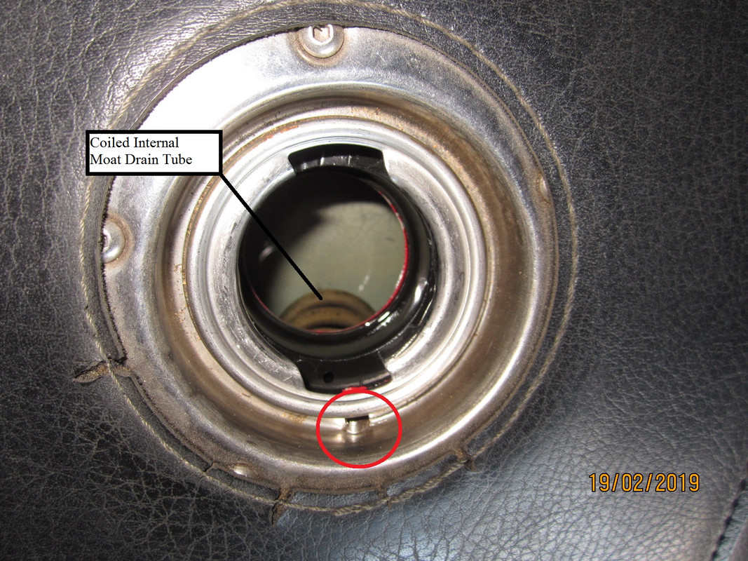 The Moat Drain on my 98EV is a little dimple in the 6 o'clock position of the fuel filler.  (Sorry, my tank has a vinyl cover.)  The drain is a coiled tube down through the tank to exit through the bottom/center of the tunnel.  The coil is necessary to allow for expansion/contraction of the tank body.